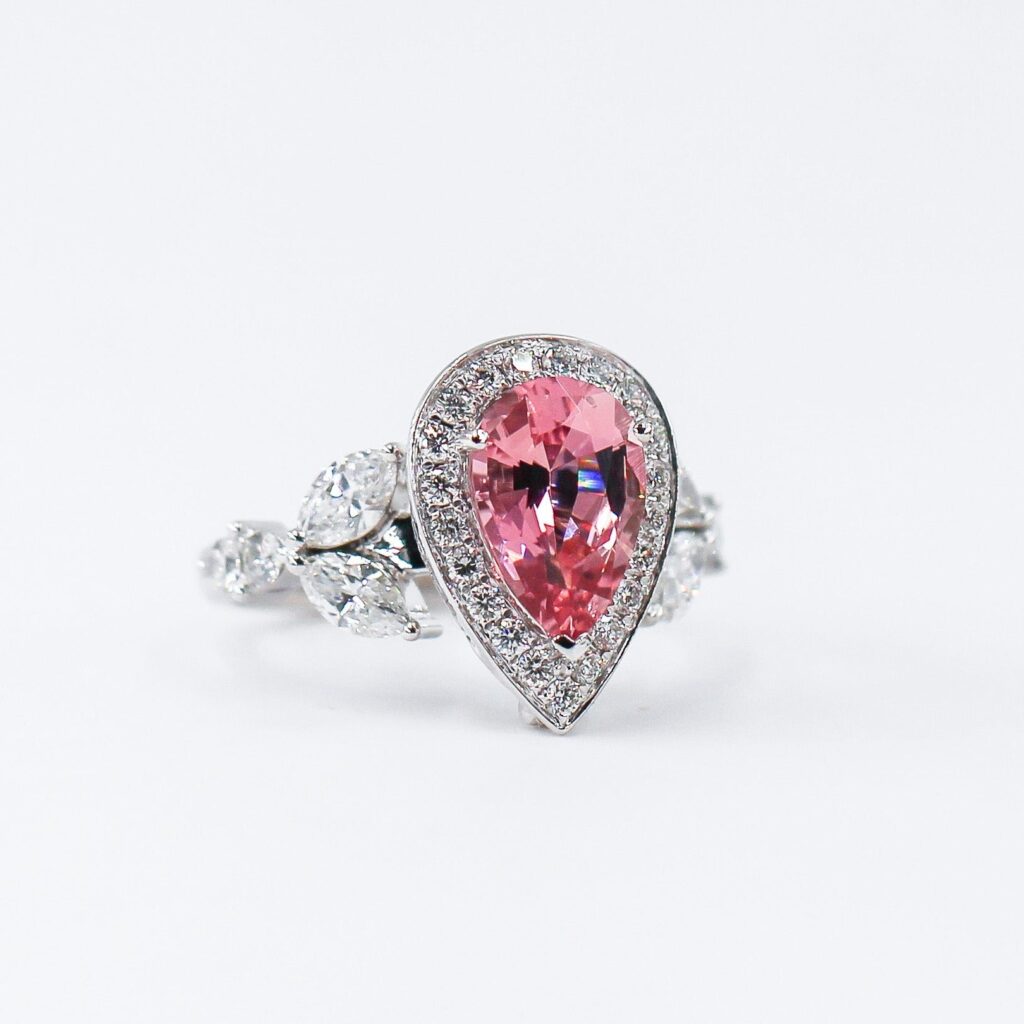 Oval cut Ruby Side Diamond Ring set with pear and round diamonds. Total diamond carat weight approx 0.3ct Centre emerald price not included. Get in touch with us for a personal quote for a diamond that’ll fit you.