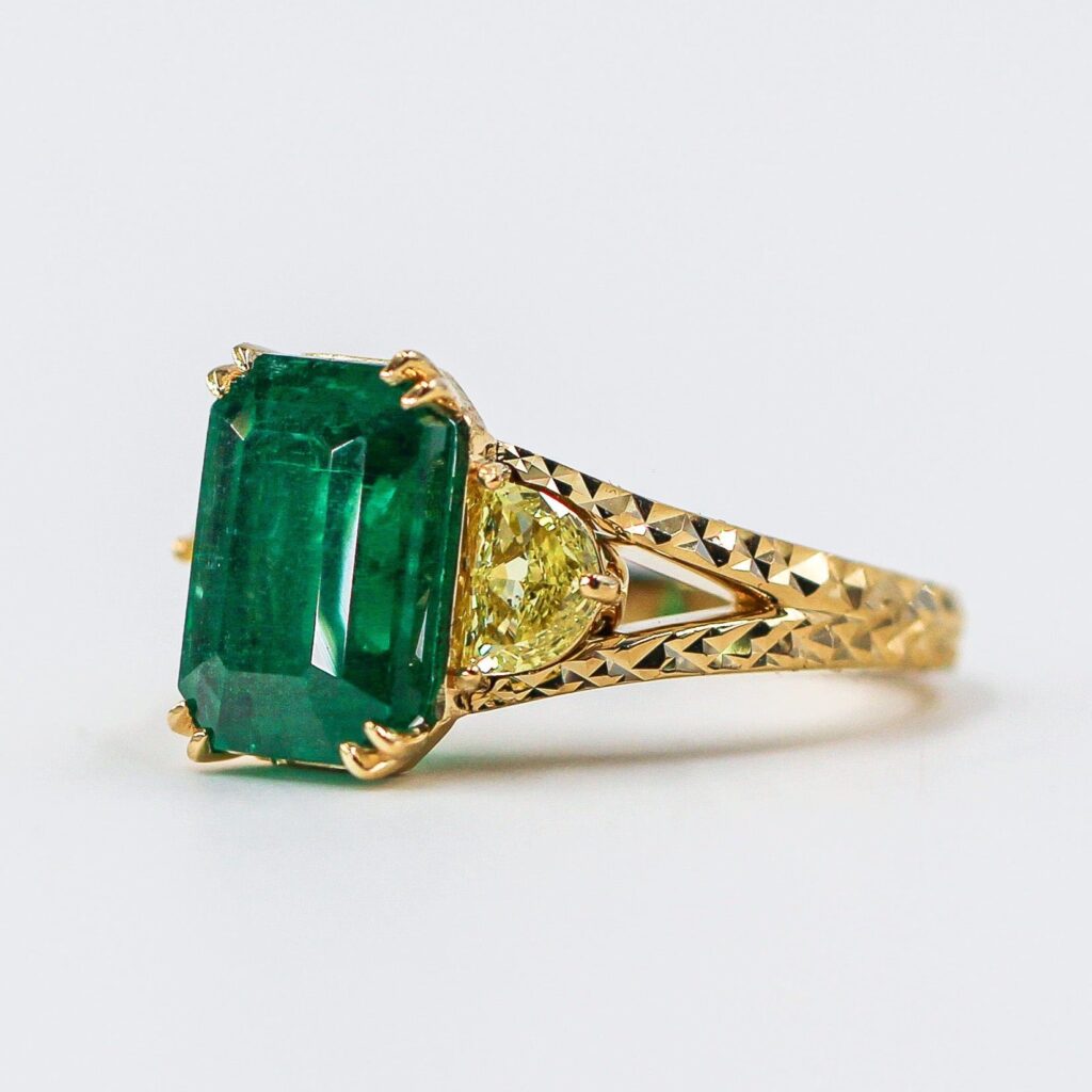 An beautiful Emerald and fancy yellow diamond 3 stone ring in 18K yellow gold Centre emerald and yellow diamonds price not included. Get in touch with us for a personal quote for a diamond that’ll fit you.