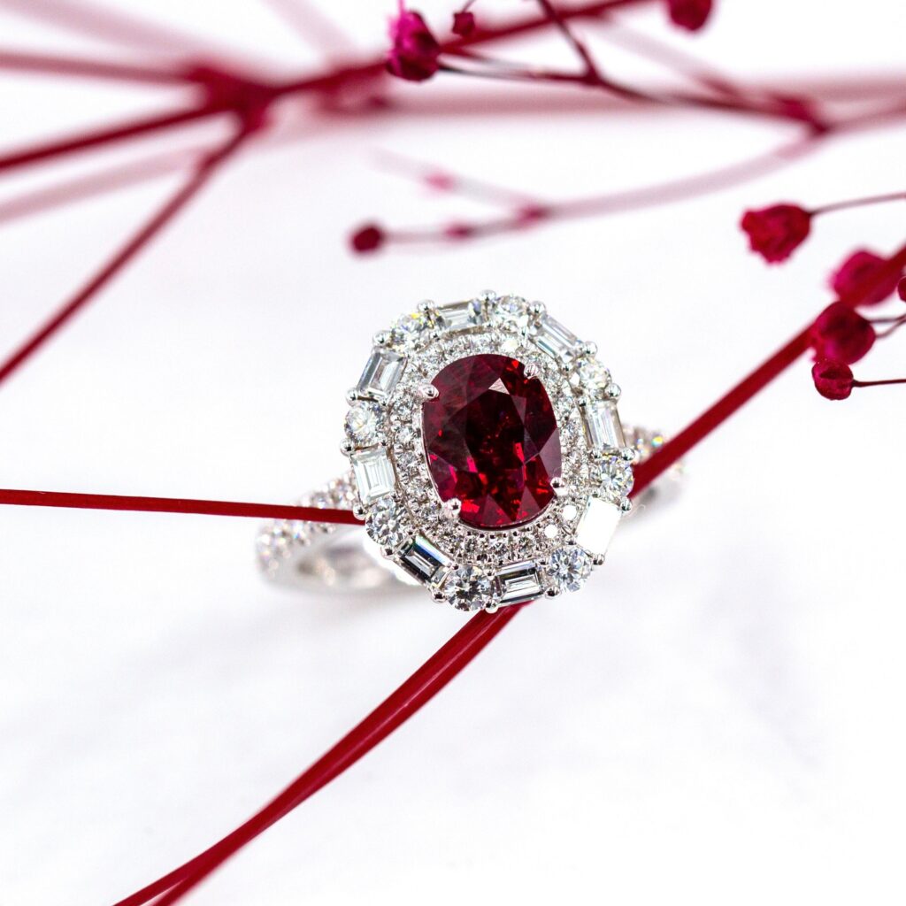 Distinctive and eye-catching, this ring features a vibrant oval cut ruby at its centre, glowing with a rich, saturated red and remarkable brilliance. The lively colour of the ruby creates a strong focal point, giving the piece a bold yet elegant presence. Surrounding the centre stone is a geometric arrangement of white diamonds, combining round […]