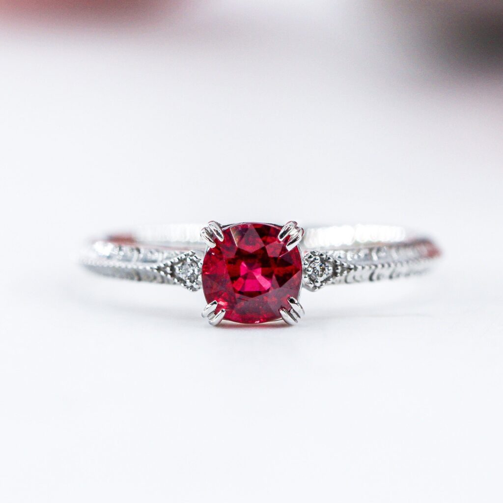 A stunning ruby round side stone ring. Elegant and timeless, this ring features a vivid cushion-cut ruby set in a refined four-claw setting, allowing maximum light to enhance the gemstone’s rich red brilliance. The ruby displays a lively, saturated tone, offering a striking yet sophisticated focal point. The band is delicately crafted with pavé-set diamonds, […]