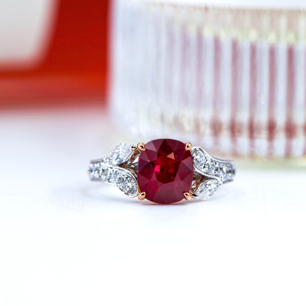 Elegant and impactful, this ring showcases a beautifully cut cushion shape ruby at its centre, glowing with a deep, vibrant red and remarkable intensity. The faceting enhances the stone’s natural brilliance, giving it a rich and eye-catching presence. Positioned on each side are trapezoid-cut white diamonds, selected for their crisp geometry and clarity. Their structured […]