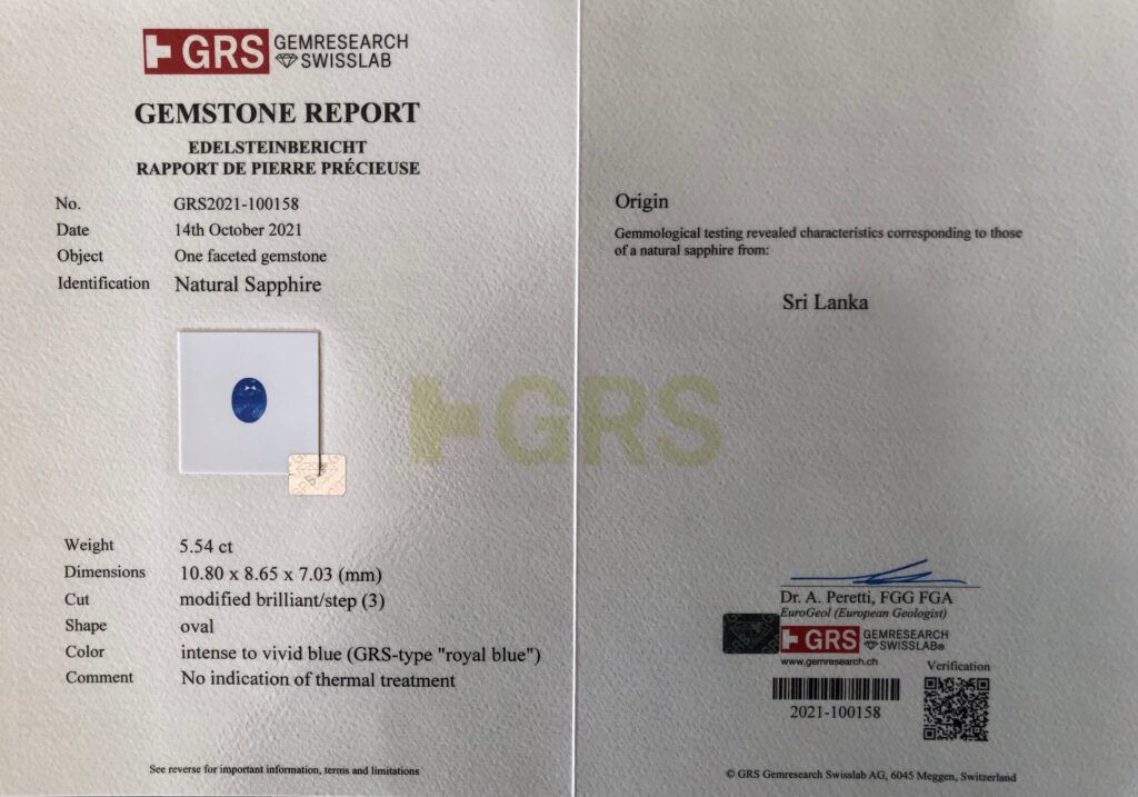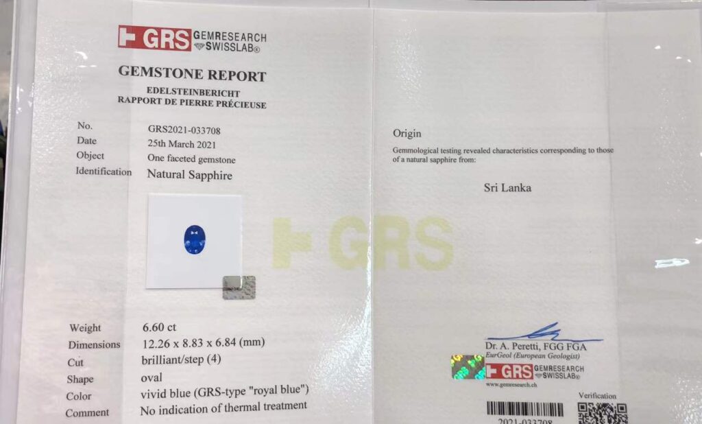 6.6carat, Royal Blue, Oval shape Sapphire, graded by GRS. A fine Blue Gemstone that’s very lively. This is non heated treatment, excellent clarity, no dark facets and excellent scintillation stone. For more information about this item please contact our customer service department. price upon request