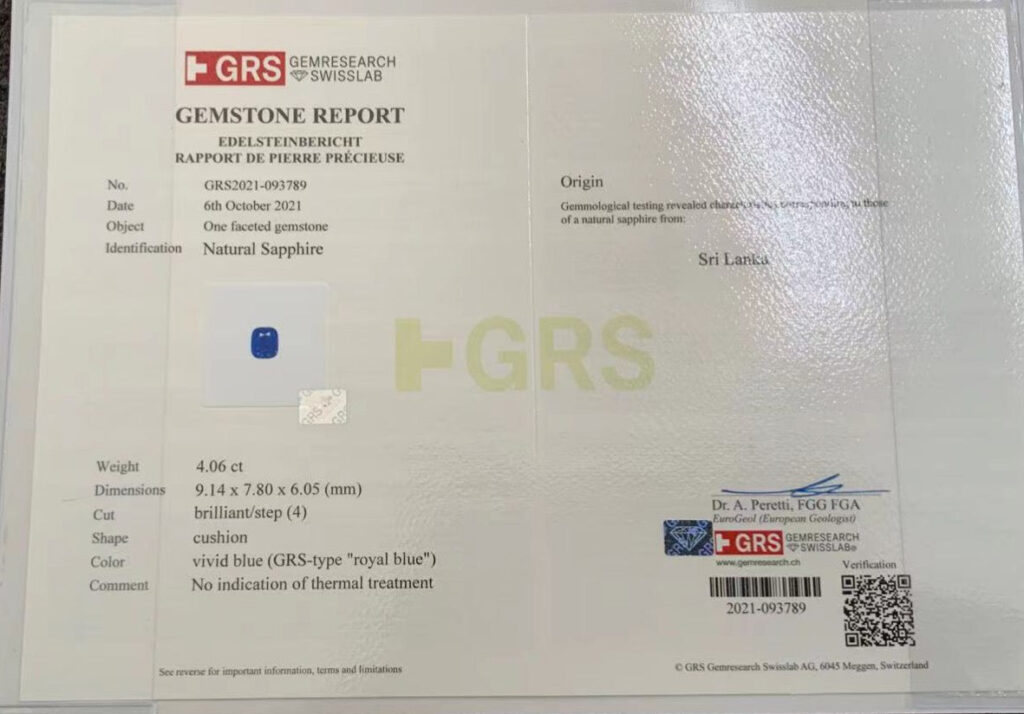 4.06carat, Royal Blue, cushion shape Sapphire, graded by GRS. A gorgeous Blue Gemstone with exceptional clarity! intense and even color distribution. Max scintillation. This is a non-treatment stone. For more information about this item please contact our customer service department. price upon request