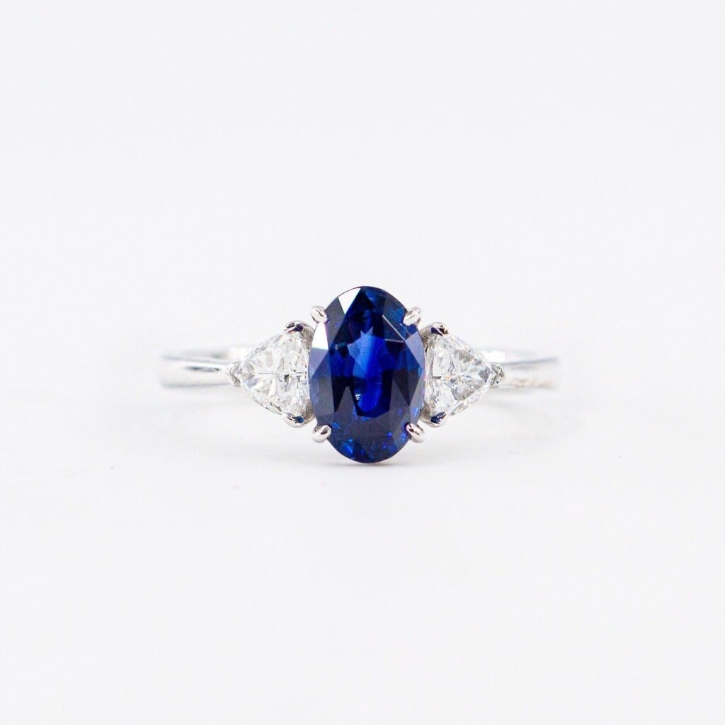 Oval royal blue sapphire three stone engagement ring Total trillion diamond carat weight approx 0.5-0.6ct Sapphire price not included. Get in touch with us for a personal quote for a gemstone that’ll fit you